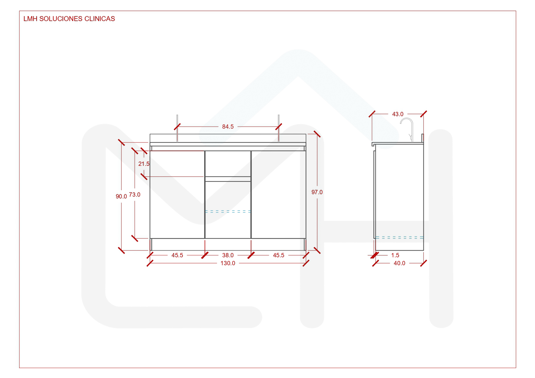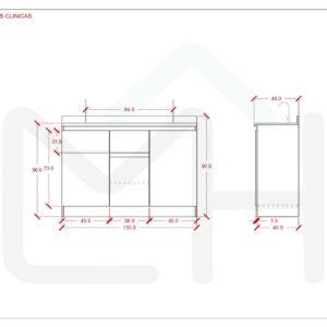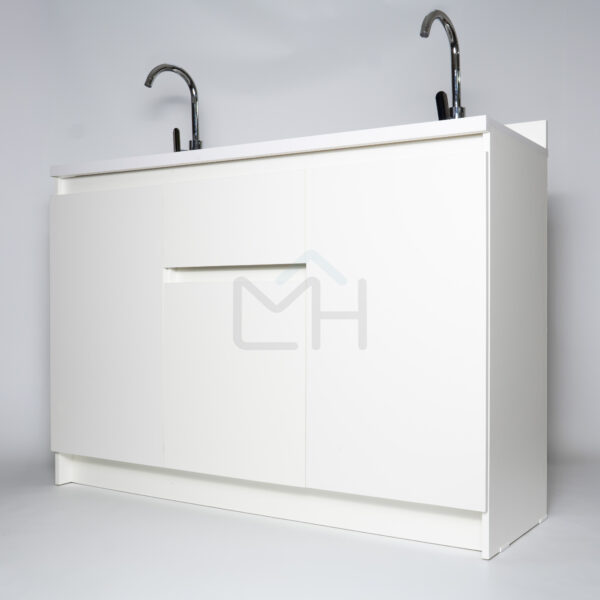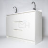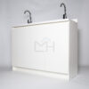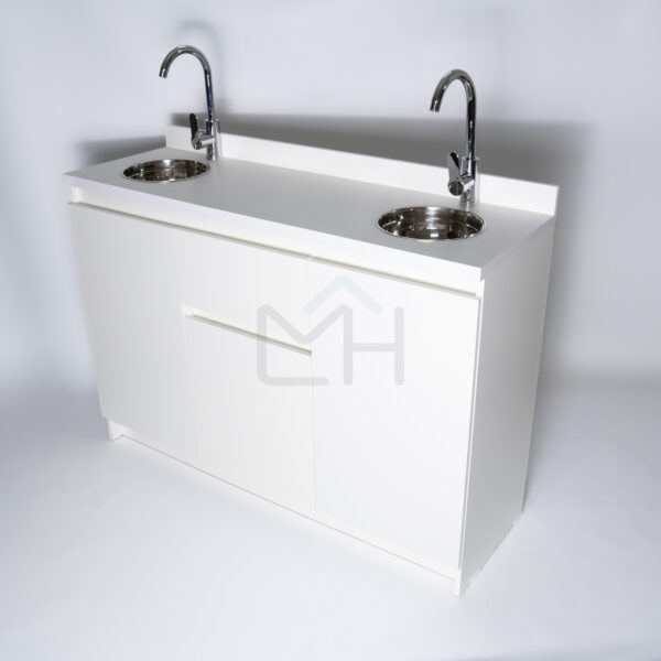 Armado con melanina blanca de 15mm, posee 1 cajón central con correderas telescópicas, 1 espacio inferior con repisa y puerta, 2 lavamanos, 2 lavafondos y griferías circulares de acero inoxidable, sifón y sistema de desagüe interno.