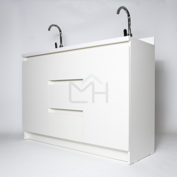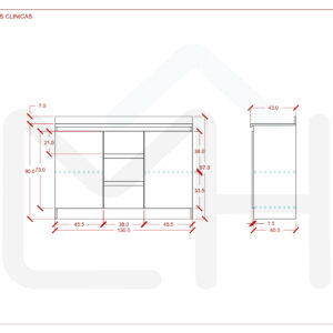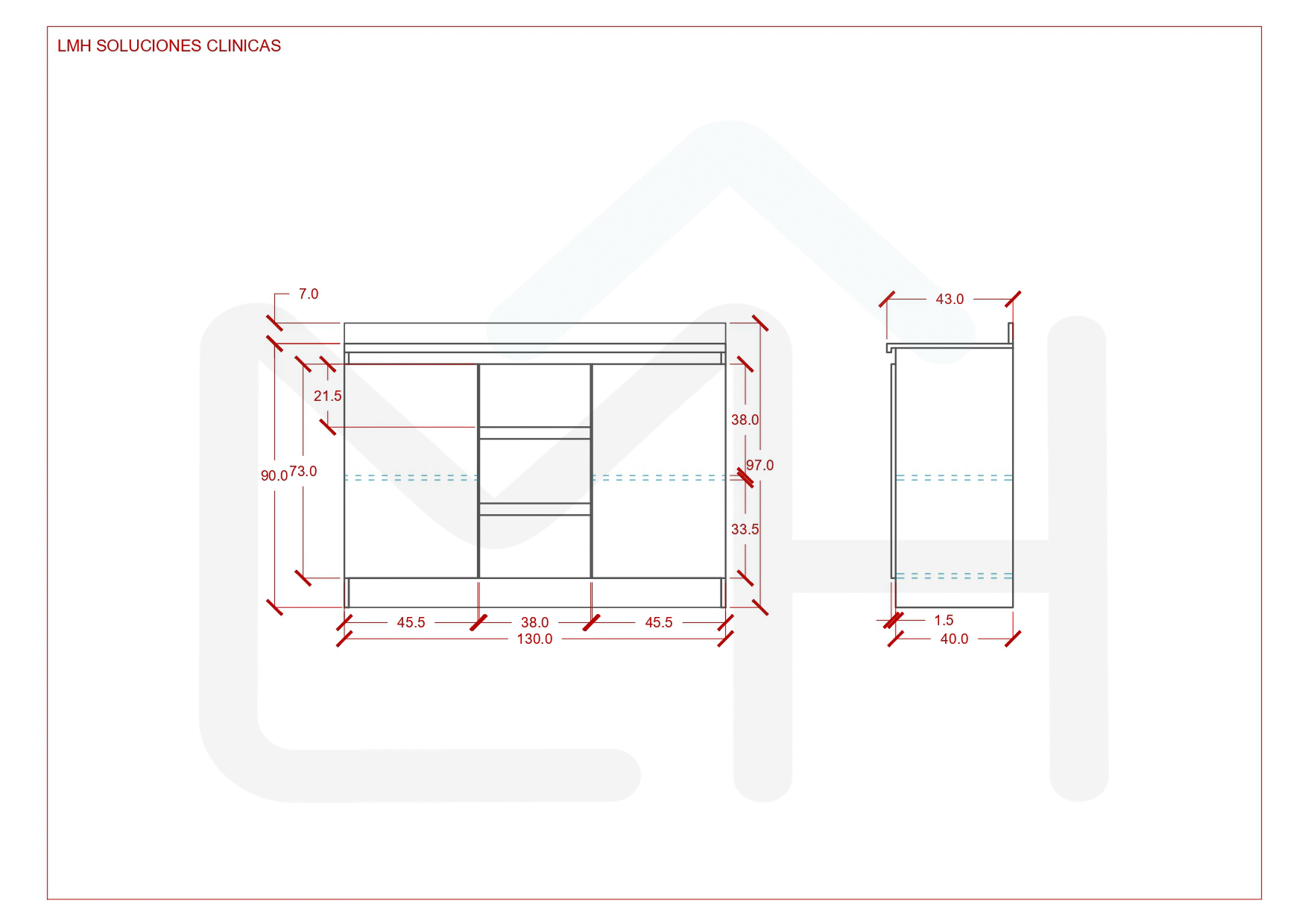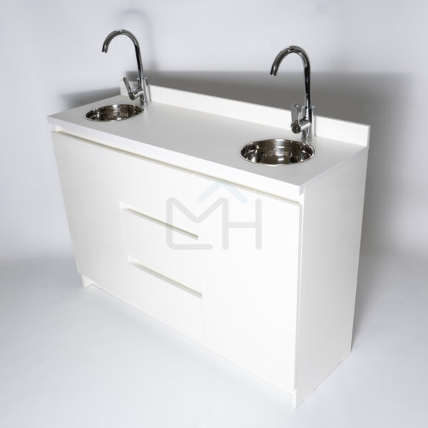 Armado con melanina blanca de 15mm, posee 3 cajones con correderas telescópicas, 2 lavamanos, griferías y lavafondos circulares de acero inoxidable, sifón y sistema de desagüe interno.