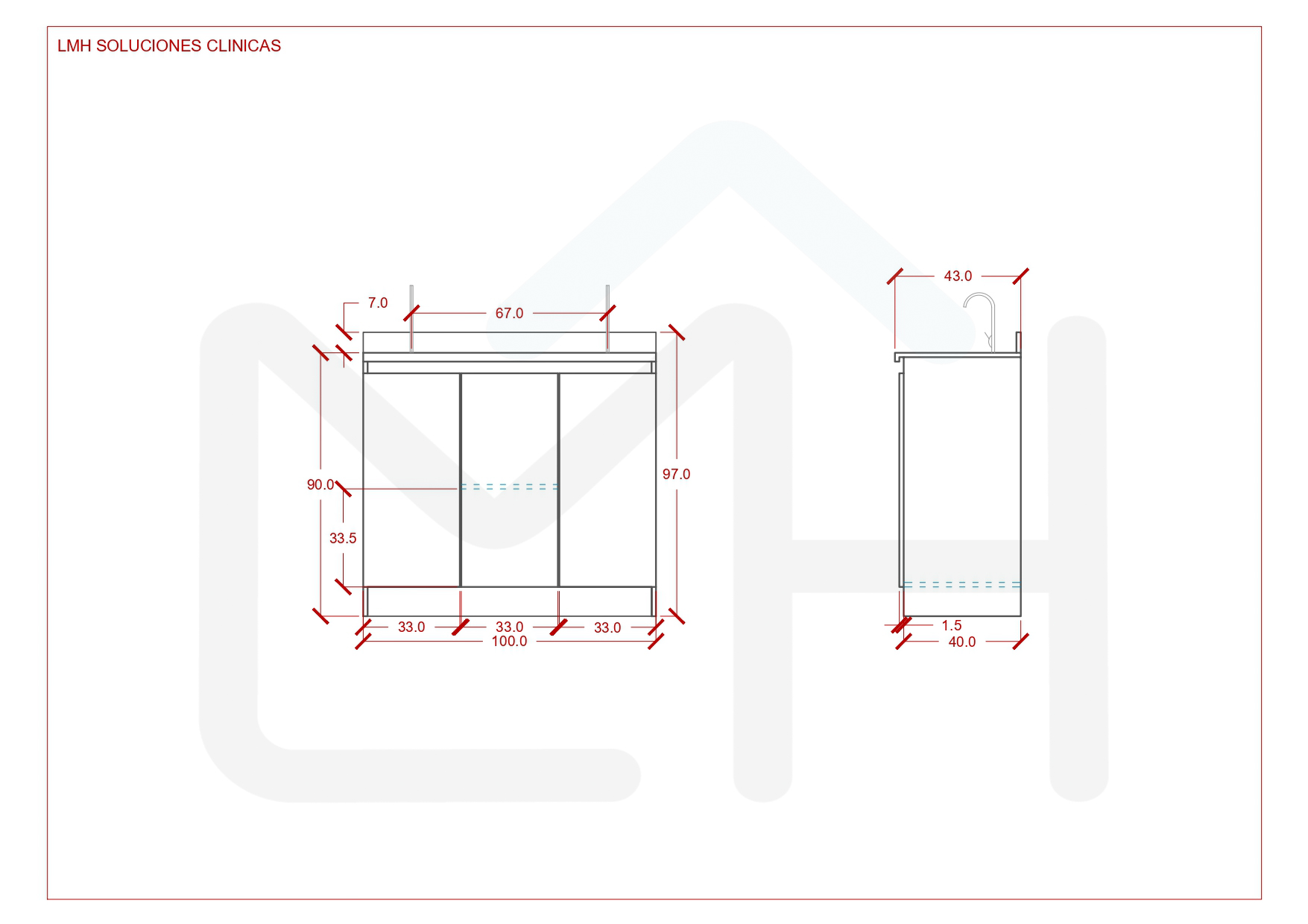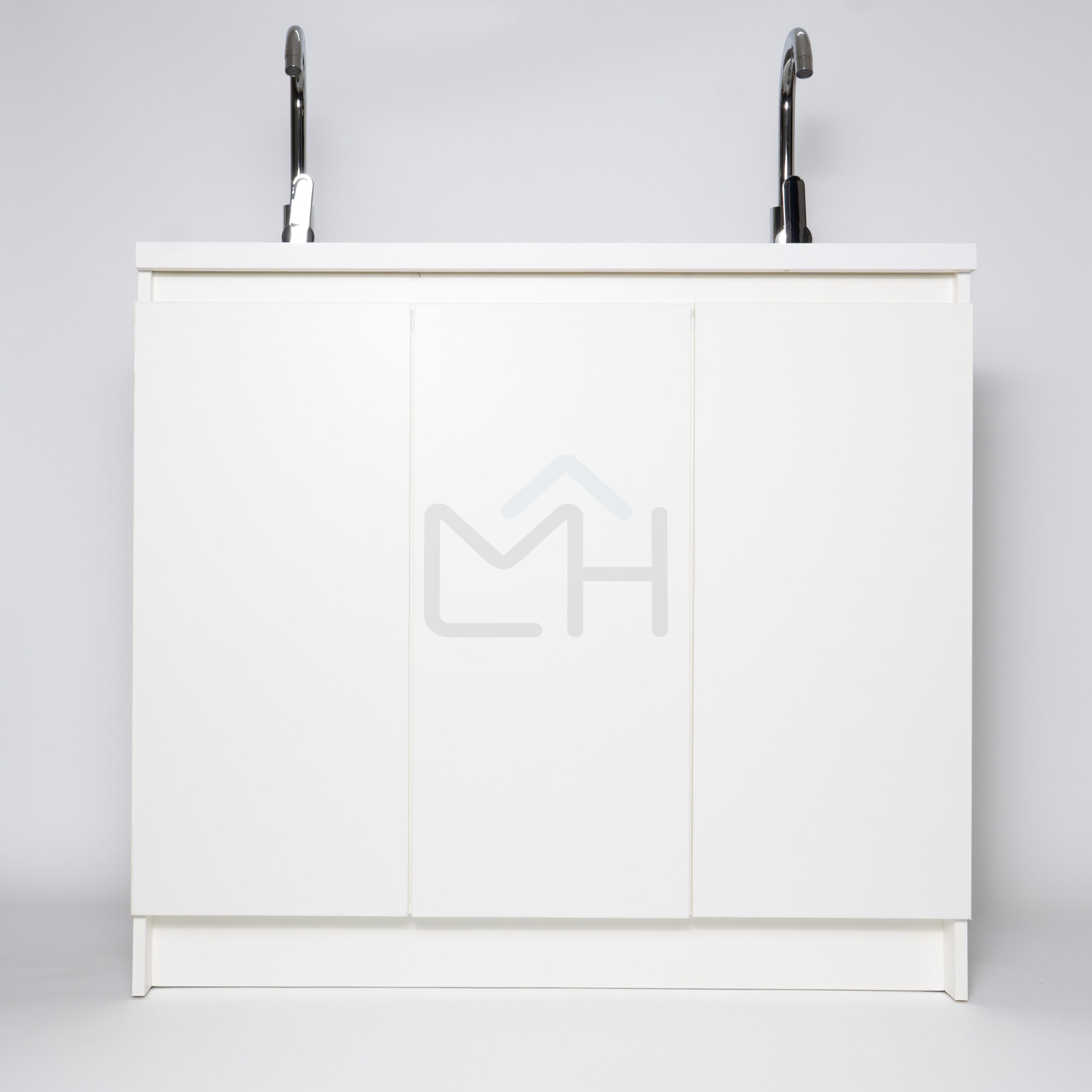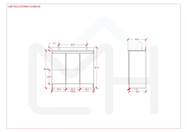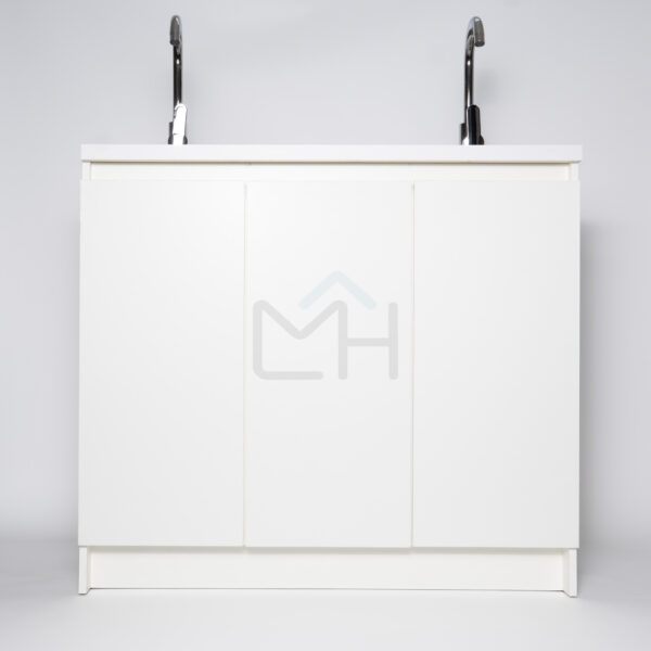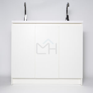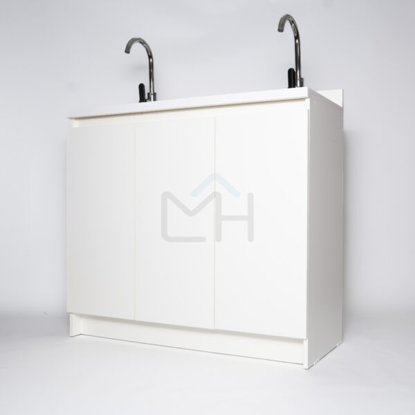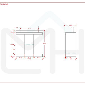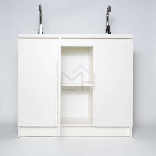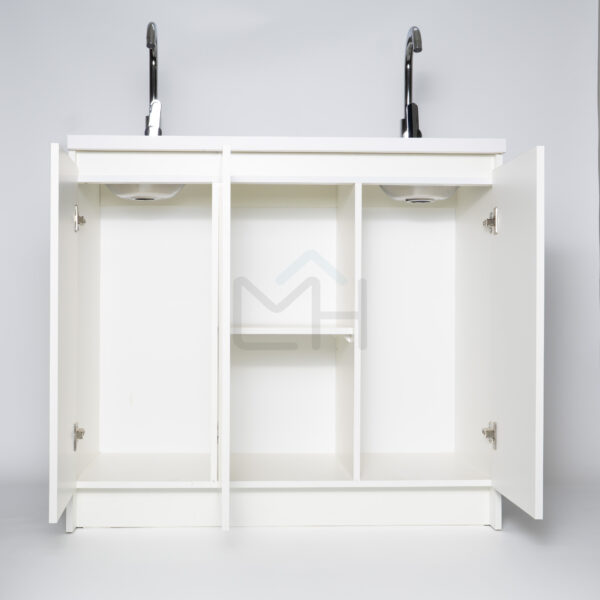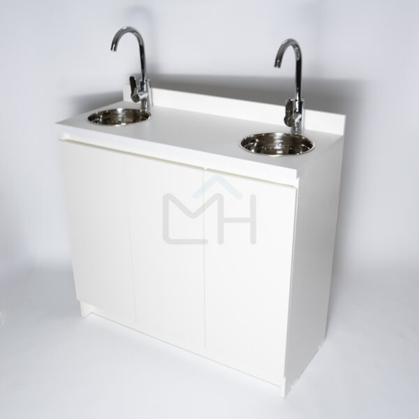 Armado con melanina blanca de 15mm, posee 2 lavamanos, griferías y lavafondos circulares de acero inoxidable, sifon y sistema de desagüe interno.